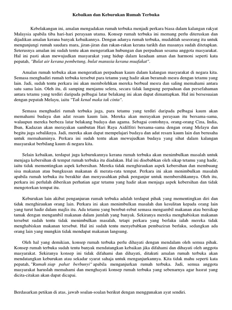 Muat turun halaman 1-34 di AnyFlip. Huraikan pendapat anda tentang amalan majlis rumah terbuka. Kebaikan Amalan Rumah Terbuka Amalan rumah terbuka sudah menjadi lumrah dalam kalangan masyarakat Malaysia.